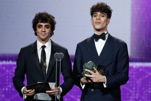 Los actores y directores Javier Ambrossi y Javier Calvo antes de entregar el premio a Mejor Película Documental, que ha logrado llevarse el film "Ara Malikian: una vida entre las cuerdas".
