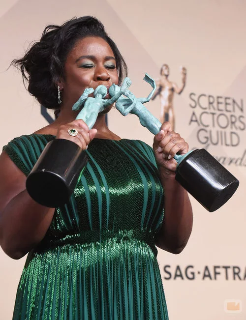 La actriz de 'Orange is the New Black' no puede contener la emoción al posar con el premio a mejor serie y actriz de comedia.