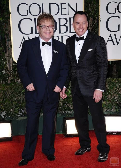 El cantante Elton John con su pareja David Furnish en la alfombra roja de los Golden Globes 2012.