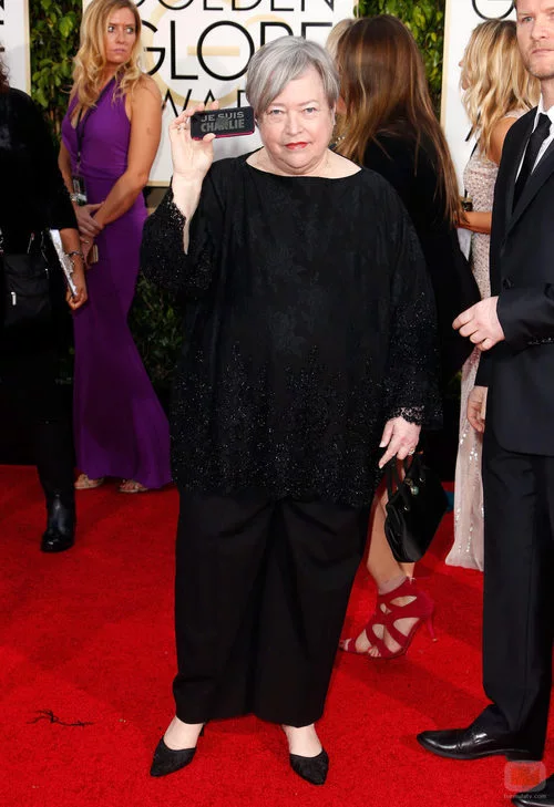 La actriz Kathy Bates recuerda los atentados de Paris con "Je Suis Charlie" a su paso por la alfombra roja de los Globos de Oro 2015.