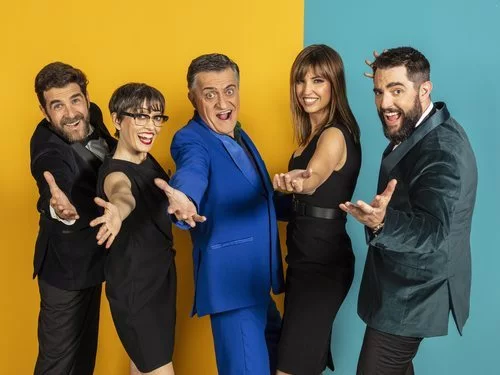 Fernando González "Gonzo", Thais Villas, El Gran Wyoming, Sandra Sabatés y Dani Mateo se muestran sonrientes en esta foto de celebración de los 2000 programas de 'El intermedio'.