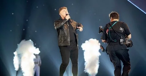 Michael Rice, representante de Reino Unido, interpretando el tema "Bigger than us", sobre el escenario en la Gran Final de Eurovisión 2019.