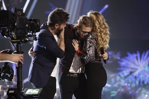 Pablo López y Miriam Rodríguez abrazan a Andrés Martín en 'La Voz'