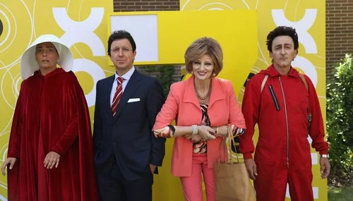 Los intérpretes Mónica Pérez ('El cuento de la criada'), Jordi Ríos (Matías Prats), Olga Hueso (María Teresa Campos) y David Fernández ('La casa de papel') posan en la presentación de 'Homo Zapping'.