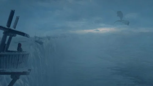 Daenerys Targaryen observa como vuela uno de sus hijos dragón, Drogon, desde lo alto del Muro en el 7x06 de 'Juego de Tronos'.