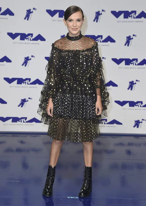 La jovencísima actriz Millie Bobby Brown posa en la gala de los MTV Video Music Awards 2017 celebrados en Inglewood, California.