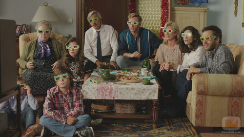 (17x01) La familia, junta en el salón, se disponen a probar las gafas para experimentar qué es eso de la tercera dimensión.