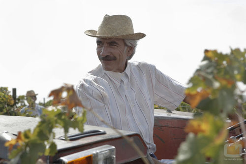 Antonio Alcántara interpretado por el actor Imano Arias, aparece sonriente con un gorro subido en un tractor en la vendimia.