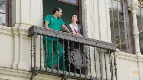 Rober (Alfonso Sánchez) y Maritxu (Ane Gabarain) conspiran en el balcón contra la relación de Iñaki y Carmen en el capítulo 12 de 'Allí abajo'.