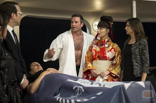 Palmira (Rossy de Palma), ayudada de sus amigos, finge su muerte en el quinto capítulo de la comedia 'Anclados'.