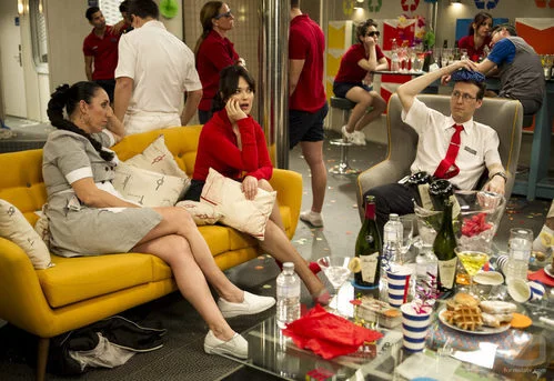 Palmira (Rossy de Palma), Teresa (Sara Vega) y Mariano (Joaquín Reyes) descansan en el sofá en el cuarto capítulo de 'Anclados'.