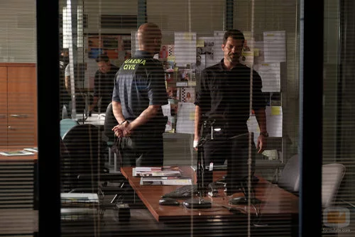 (01x10) Héctor (Rodolfo Sancho) y su amigo están hablando en la comisaría de Campoamargo tras la fugaz visita de este último a Almería