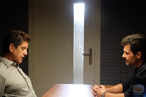 (01x10) En la comisaría de la Guardia Civil, Héctor (Rodolfo Sancho) interroga a Juan Rueda (Pedro Casablac) después de haber sido detenido.