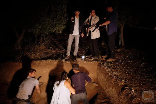 (01x09) Juan Rueda (Pedro Casablanc), Fernando (Patrick Criado) y el capataz de Juan Rueda (Luka Peros) se encuentran con el trío de Guardia Civiles que están buscando nuevas pistas en propiedad privada