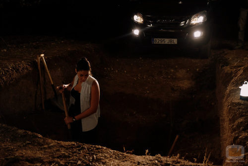(01x09) La Guardia Civil no descansa, y sigue buscando nuevas pistas por la noche. Lola (Nya de la Rubia) sostiene con una mano una azada que le servirá para indagar en la tierra