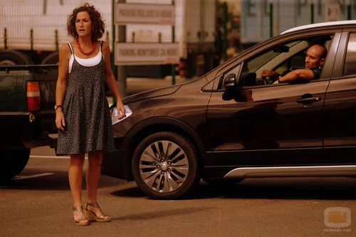 (01x12) Marta (Belén López) pasea por las calles de Campoamargo bajo la sombra de los coches que no paran de pasar