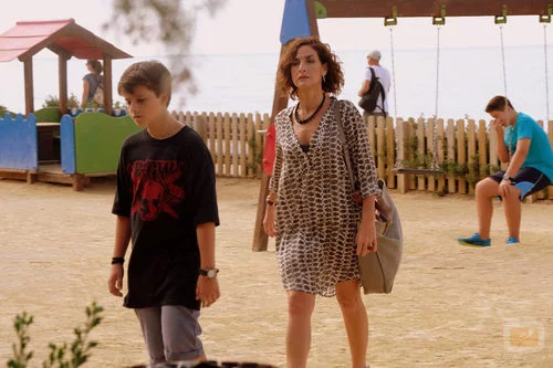 (01x11) Marta (Belén López) camina hacia adelante y protege a su hijo Nacho (Máximo Pastor) tras la reprimenda de su madre en el parque de Campoamargo