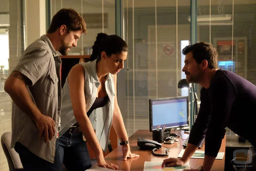 (01x09) Salva (Luis Fernández), Lola (Nya de la Rubia) y Héctor (Rodolfo Sancho) en la comisaría de la guardia civil reunidos después de los restos sin vida de las jóvenes