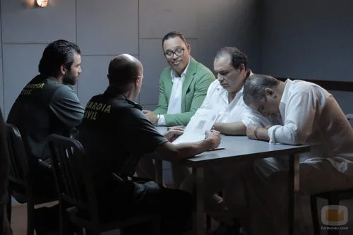 (1x05) Olmos (Pepe Viyuela) y Robles (Rubén Cortada) interrogan a los tres sospechosos de las falsificaciones de los cuadros en la comisaría de Ezcaray.