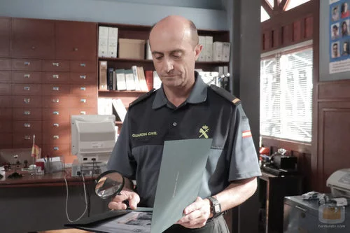 (1x04) Olmos (Pepe Viyuela) se encuentra en el despacho investigando con una lupa el nuevo caso de la pareja de policías.