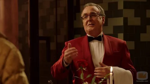El actor catalán, Ferran Rañé, aparece vestido con chaqueta roja y pajarita negra en un restaurante en la serie 'Buscando el Norte'.
