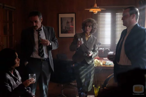 (1x02) Clara (Verónica Sánchez), Jesús (Fernando Guillén Cuervo), Margarita (Blanca Apilánez) y Rodrigo (Fernando Cayo) acompañan su reunión con una copa en 'El Caso'.