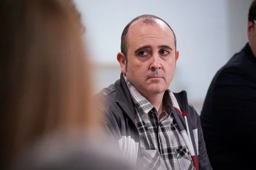 Agustín, el personaje encarnado por Carlos Areces, mira fijamente a alguien en la junta de vecinos del 11x11 de 'La que se avecina'.
