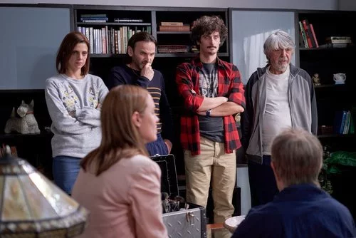 Fermín, Lola y Vicente observan curiosos a una mujer, mientras que Javi se muestra claramente sorprendido en la temporada 11 de 'La que se avecina'.
