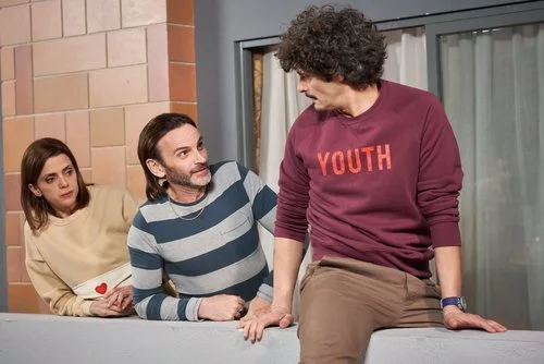 Lola mira preocupada a Javi, subido a la barandilla del balcón, mientras Fermín dialoga tranquilamente con él en la temporada 11 de 'La que se avecina'.