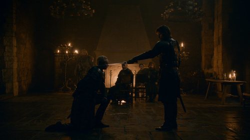 La doncella de Tarth al fin consigue lo que quiere de parte de Jaime Lannister en la sala en que se reúne la retaguardia de la batalla.