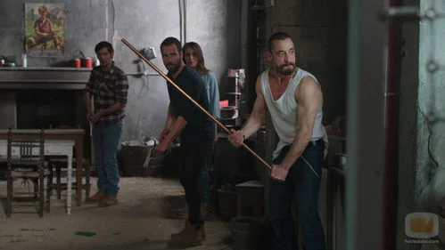 (1x04) Crespo (Ismael Martínez) tiene en un su mano una gran vara de metal para luchar contra los rabiosos. Suso también le acompaña, con el resto de los reclutados