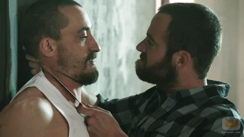 (1x02) Suso(Carles Francino) amenaza con un cuchillo a Crespo (Ismael Martinez) en una situación muy crítica para ambos personajes