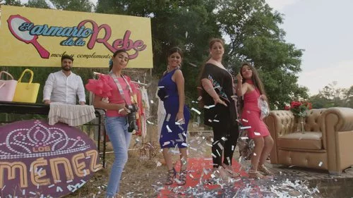 La familia Jiménez posa bajo un cartel en el que se anuncia ropa y complementos en "El armario de la Rebe" con motivo de la cuarta temporada del programa de Cuatro.