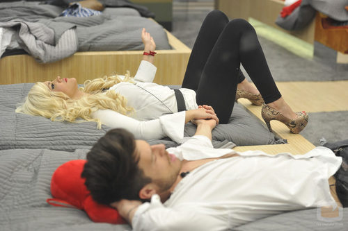 Los concursantes, juntos dentro de la casa de 'GH VIP 3', tumbados en la cama con las manos cogidas, tras ser nominados.