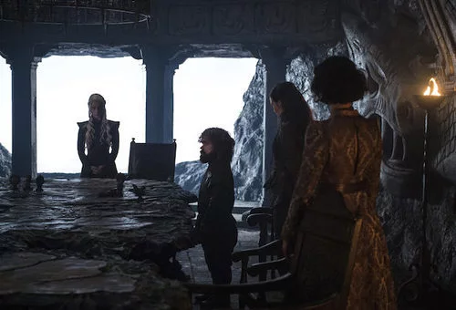 Daenerys Targaryen (Emilia Clarke), Tyrion Lannister (Peter Dinklage) y Yara Greyjoy (Gemma Whelan), junto a la mesa de Rocadragón en el segundo capítulo de la séptima temporada de 'Juego de Tronos'.