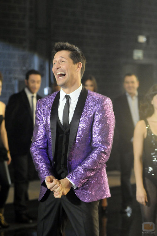El presentador de 'DEC' se ríe durante la grabación del videoclip de temporada. En la foto, va vestido con una chaqueta morada.