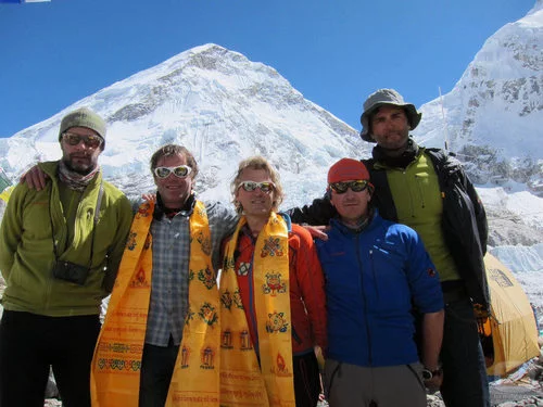 El equipo de 'Desafío Everest' posa en familia tras una puja realizada en el Campo Base del Everest.
