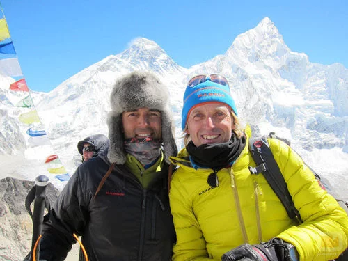 Jesús con Rafa, compañero habitual, en Kala Pattar a 5.550 metros de altitud, con el Everest y Lhotse de fondo.