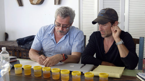 Bryan Fogel, acompañado por un científico ruso, analizan muestras de orina en un fotograma de 'Ícaro', documental de Netflix.