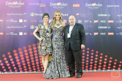 La representante de España y los presentadores de esta edición del 'Festival de Eurovisión 2015' durante la Ceremonia de Bienvenida del Ayuntamiento de Viena.