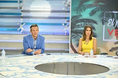 Los presentadores de 'El Programa del Verano', Joaquín Prat y Patricia Pardo, posan en la mesa del plató del programa.