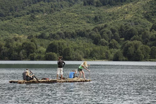 Tres de los concursantes de 'El puente' emplean una estructura de la construcción para navegar por el río.