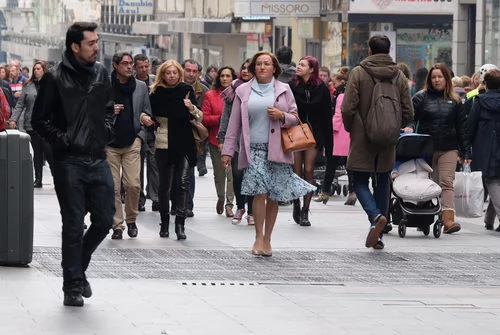 Carlos Santos da vida a dos personajes, por un lado a Sergio y por otro a Avelina, a quien vemos en esta imagen pasear por la madrileña calle Preciados.