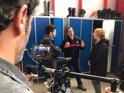 David de María y Blanca Portillo se encuentran hablando con una bombera profesional en la foto, para el programa 'Ellas' de TVE