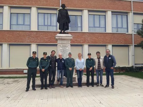Pepe Viyuela y Blanca Portillo posan frente a una estatua con el equipo de 'Ellas', programa de TVE, acompañados de agentes de la Guardia Civil.