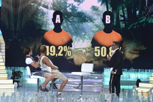 Nacho Vidal y Christofer, finalistas de 'Supervivientes 2015', observan junto al presentador del programa, Jorge Javier, los porcentajes de los votos definitivos.