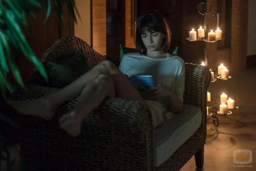 (1x05) Ester (Úrsula Corberó) tumbada, lee un libro concentrada y a oscuras en el quinto capítulo de 'La Embajada'.