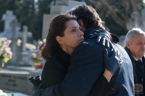 (1x05) Olga (Alicia Borrachero) y Luis (Abel Folk), muy afectados, se abrazan en el entierro de Bernardo en 'La Embajada'.