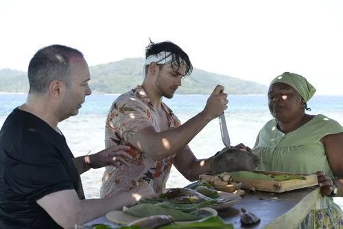 Sergio Carvajal intenta abrir un coco ante la mirada de Maestro Joao en 'Supervivientes 2018'