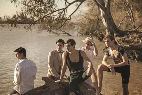 El reparto masculino de 'La otra mirada', la serie de época de La 1, en una de las localizaciones de exteriores de la ficción.